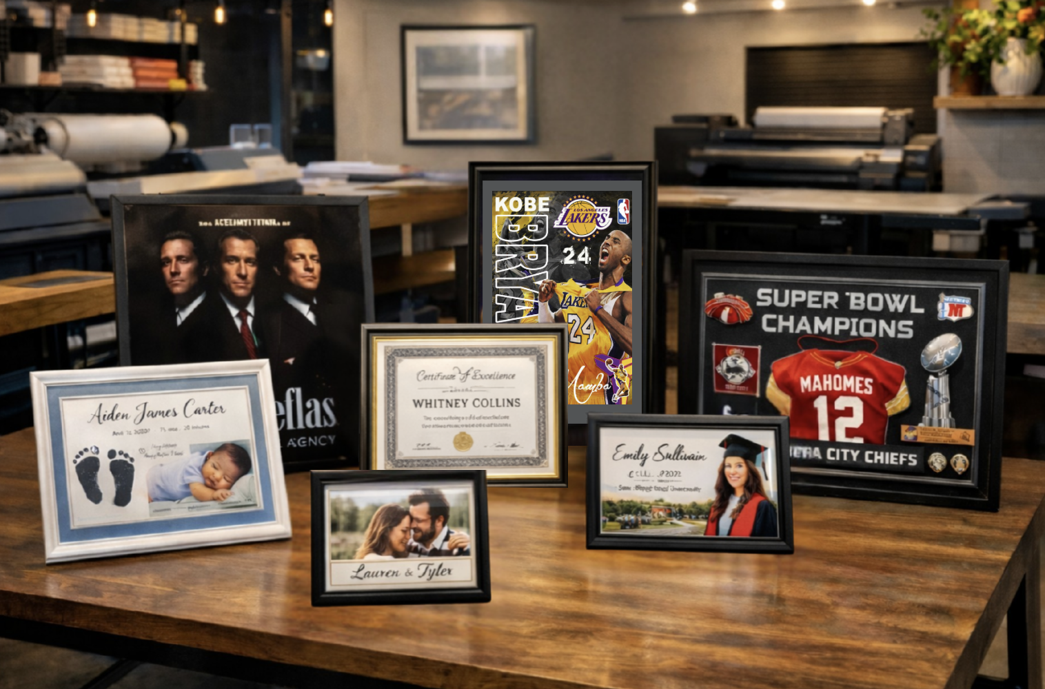 We design and print custom memorabilia and collectables. We also offer full framing for beautiful displaying of your special pieces.